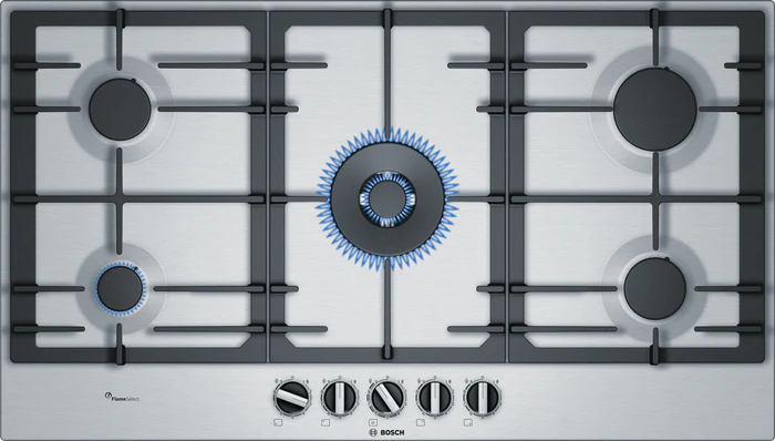 Gas hob (built‑in) with 5 burners including a dual‑wok burner (center) for very powerful cooking or gentler simmering.