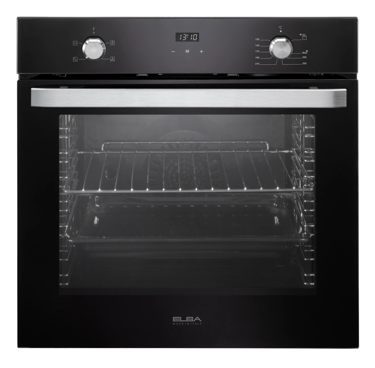 Built-in Gas Oven from ELBA, model EL 10 XLB FG, 60 cm in size with an elegant black design and a 65-liter capacity. Features a convection fan for even heat distribution, a gas grill with rotisserie, and a cooling fan for added safety after use. Easy control with durable metal knobs and a digital timer display. Professional performance and Italian quality for a modern kitchen.