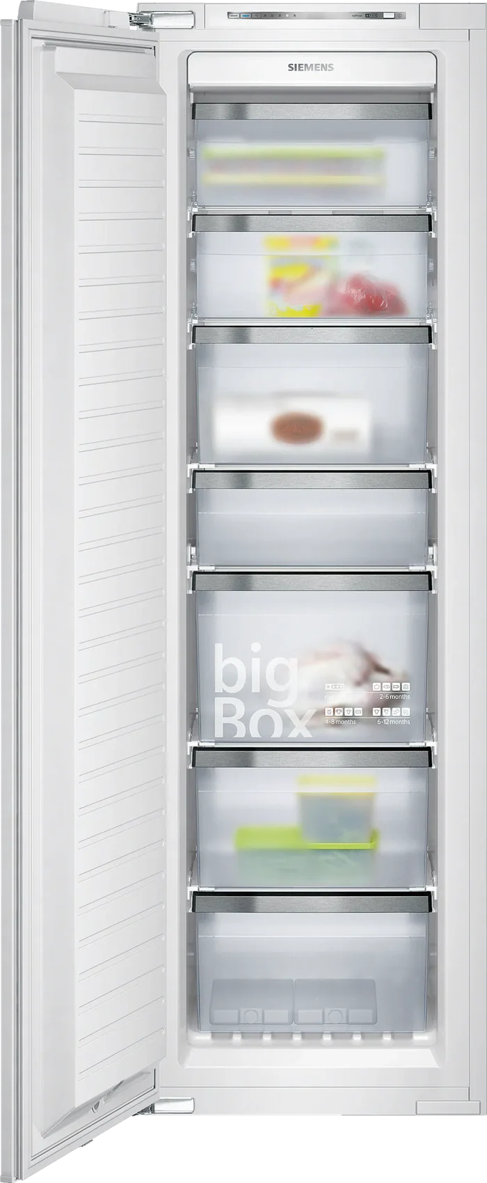 SIEMENS GI38NP60 Integrated Freezer <60cm> 213Lit noFrost technology prevents icing and frosting so you never have to defrost again. SoftClosing Door: door closes automatically and softly when it is open at a 20° angle or less. The superFreezing button reduces the temperature for a set time, to quickly freeze newly added food items. The multiAlarm system notifies you visually and acoustically if the temperature goes up. 60cm>