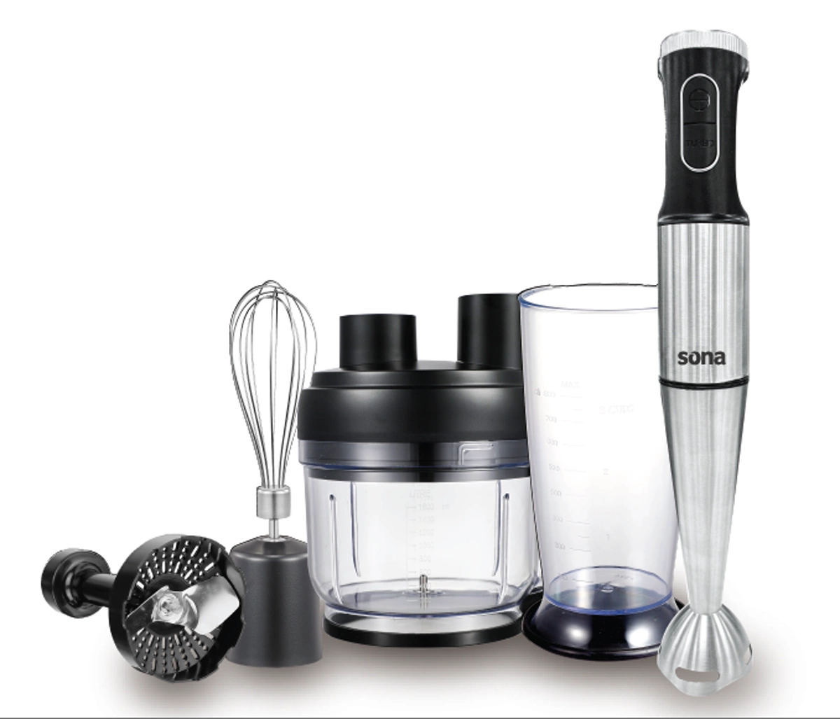 The Sona multifunctional hand blender, powered by 1500W, combines powerful performance with a practical design. Featuring a low-noise copper motor, a durable stainless steel and plastic body, and variable speed with turbo control. Includes dual-layer titanium blades, an 800ml cup, a potato masher, a stainless steel whisk, and a 2.5L food processor for chopping, mincing, and slicing.